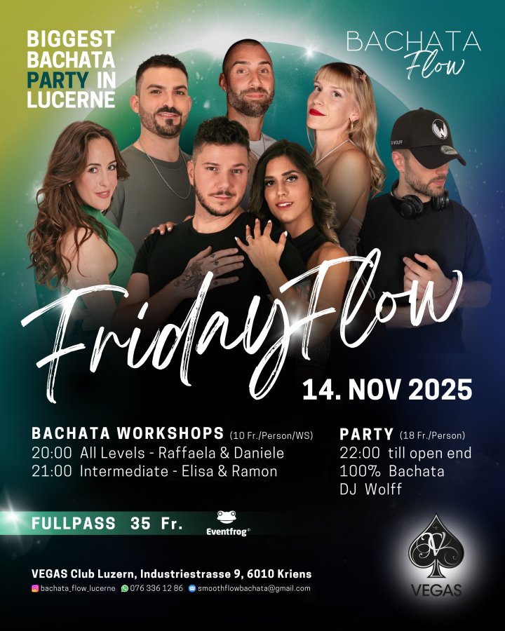 Join Lucerne's biggest bachata party! Take the chance to learn, dance, and celebrate bachata at the Friday Flow Party on Friday, November 14, 2025 ✨