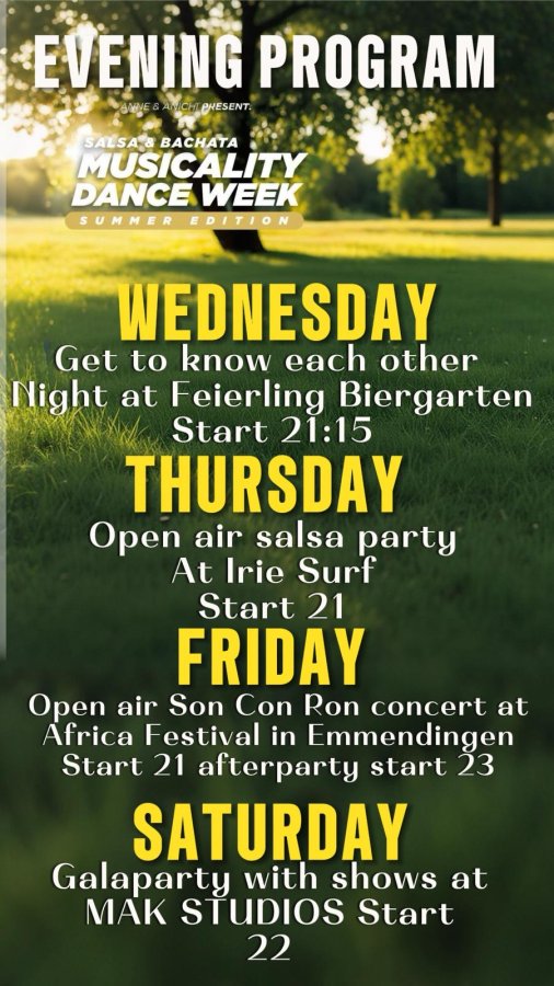 We will have a get toghether on wednesdayin a beautiful Beergarden, Thursday we will host an open air Party at Iriesurf, Saturday will be the Gala Night with Shows at our venue.