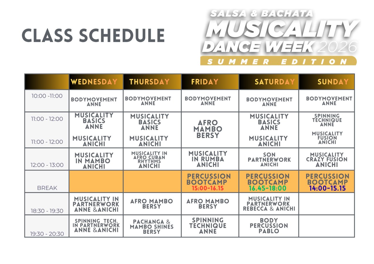 You will start your morning with Bodymovement & Danza Cubana, going through the different parts of your body, after that we dive deep into the music : Mambo on 2, Son, Rumba Cubana, Spinnig Technique, Partnerwork (Musicality in Partnerwork).
