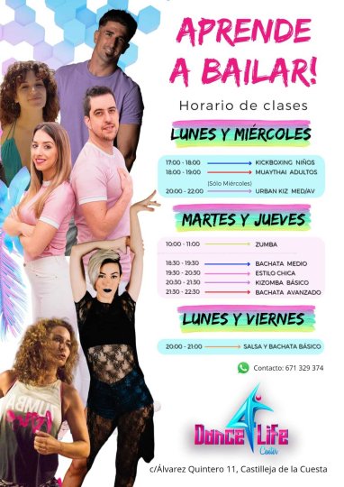 Academia de baile especializada en bailes latinos. Tenemos diferentes estilos de baile en pareja, clases de bachata , salsa y Kizomba y también contamos con clases de Zumba y Kickboxing para adultos y niños enfocadas más en el entrenamiento y el ejercicio físico. En nuestra escuela podrás disfrutar de un ambiente familiar y cercano a la vez que aprendes con nuestros profesores certificados en cada materia. También disponemos de las mejores instalaciones para el buen disfrute de tus clases de bail con suelo de parquet, espejos y aire acondicionado. Tambien tenemos un grupo de baile donde organizamos salidas de baile los fines de semana con todos los alumnos. Tu academia de baile en el Aljarafe te espera en Castilleja de la Cuesta. Bailamos?