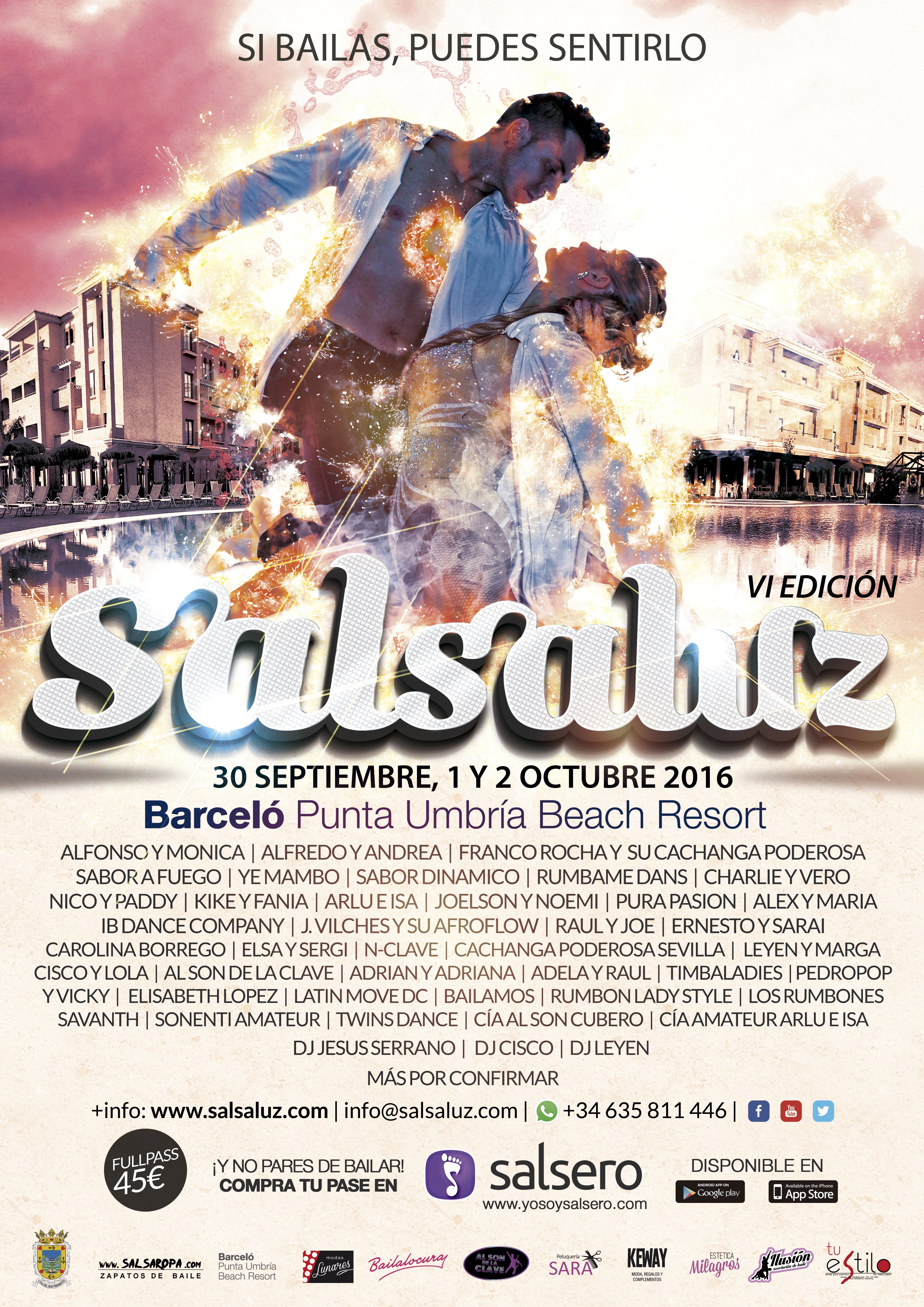 Del 30 de Septiembre al 2 de Octubre del 2016 se celebra la 6ª edición del Congreso de Bailes Latinos SALSALUZ. Tres días donde el Hotel Barceló Punta Umbría Beach Resort se convierte en un increíble espectáculo de luz, sonido y arte, para que todos los amantes del baile disfrutemos juntos de una experiencia inolvidable en un emplazamiento único.