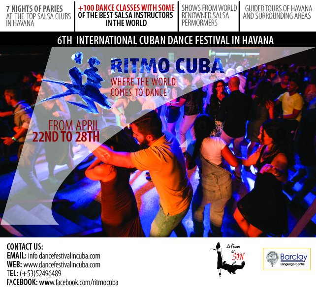 Ritmo Cuba es un encuentro internacional único en el que bailarines, estudiantes, maestros y coreógrafos de todo el mundo vienen a compartir el amor por la danza latina en La Habana Cuba – el lugar de nacimiento de la salsa. El festival cuenta con más de 60 de los mejores profesores de salsa de toda Cuba y del mundo – incluyendo a los principales instructores de baile de cada una de las principales escuelas de salsa de La Habana.