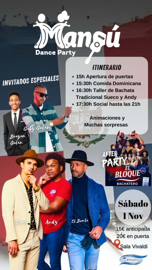 Ven a disfrutar de la mejor fiesta. Dominicana en Barcelona con profes de talla internacional, animaciones y talleres. Alucinantes. A las 15h recepción de asistentes, 15:30 comida Dominicana,a las 16:30 Taller de bachata tradicional Con Sueco y Andy desde Madrid, Animaciones con Jorge El Bomba y rifa de dos premios sorpresa