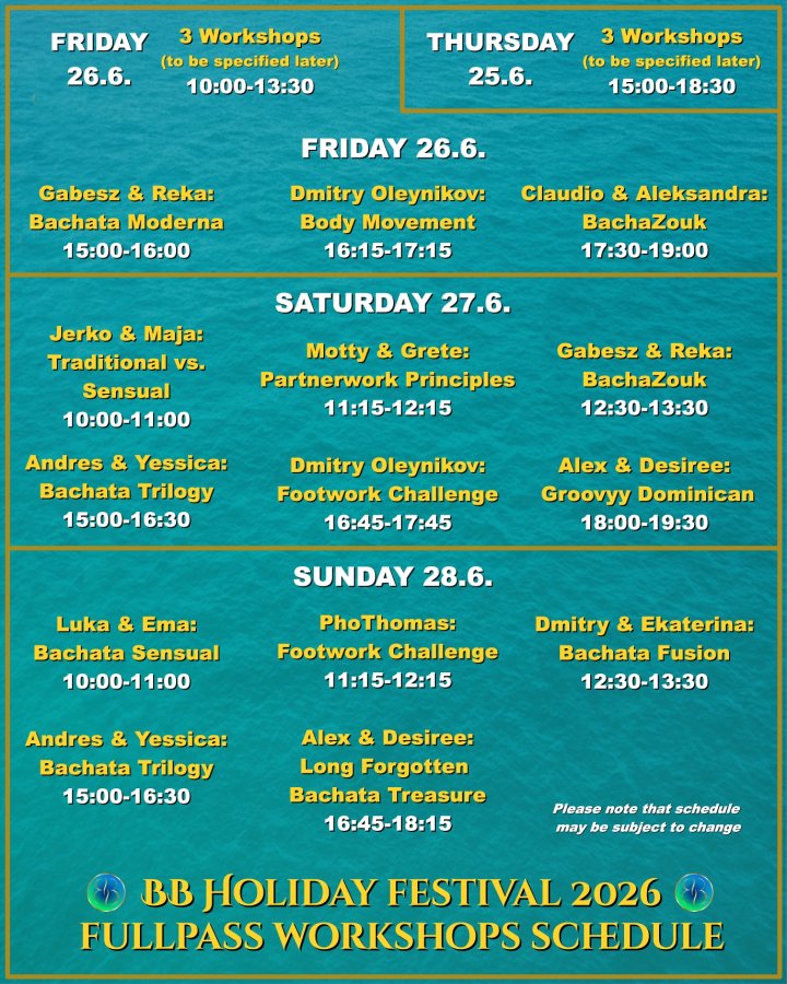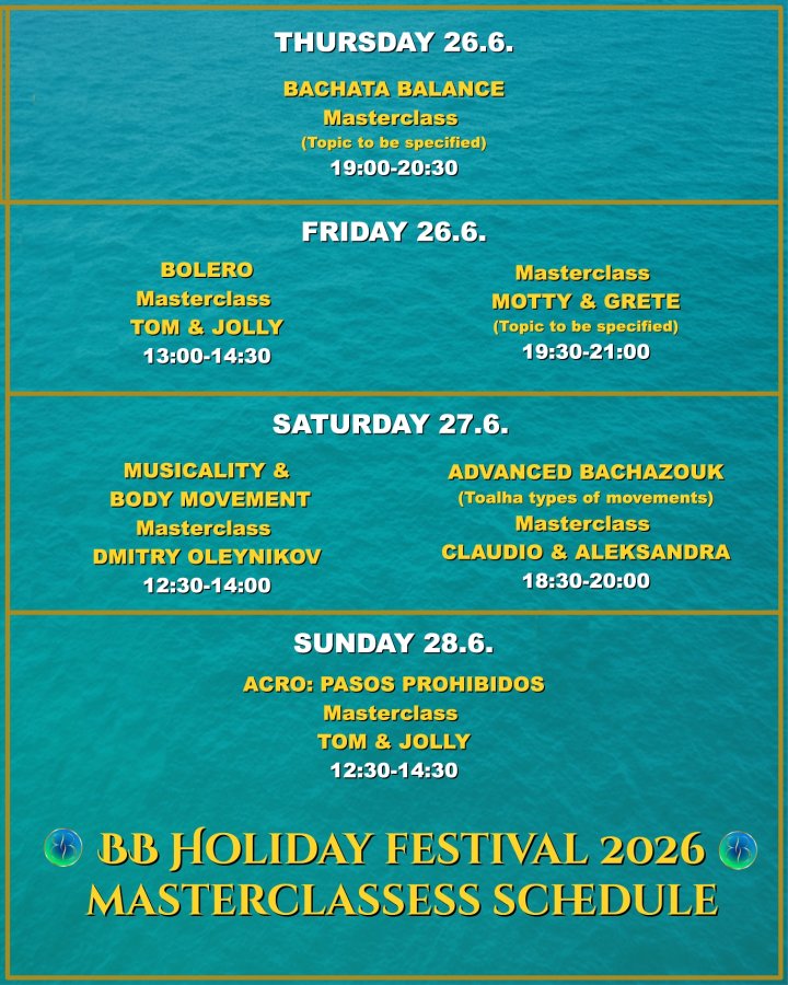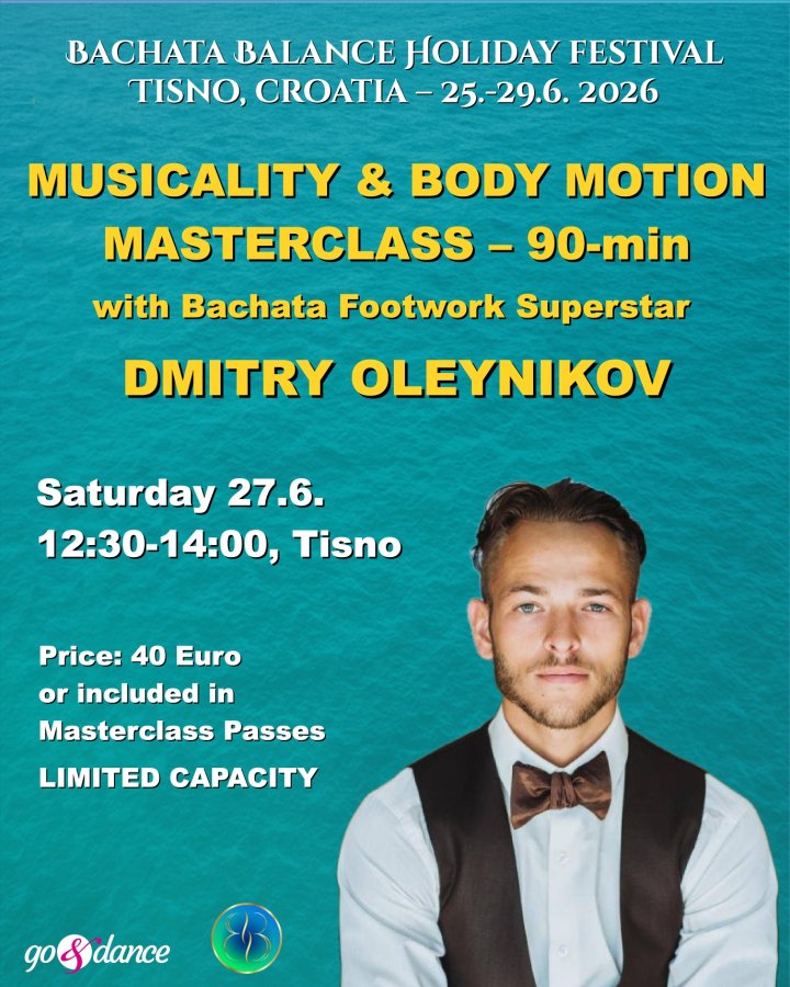 ✔️ Masterclasses, 90-minute special workshops (Musicality with Oleynikov, Advanced BachaZouk…)