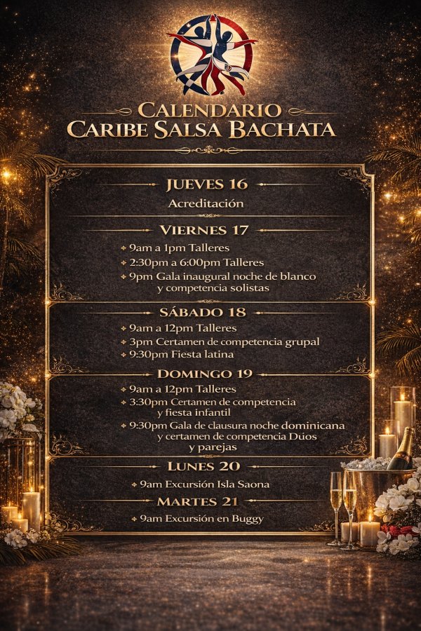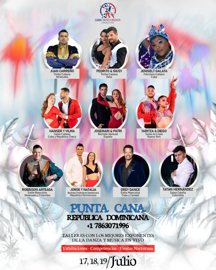 Disfrutarán de 3 días intensos de talleres, fiestas y competencias del 17 al 19 de julio. Luego continuaremos con 2 días de excursiones inolvidables en buggy y a la hermosa Isla Saona del 20 al 21, finalizando esta gran experiencia el 22 de julio.