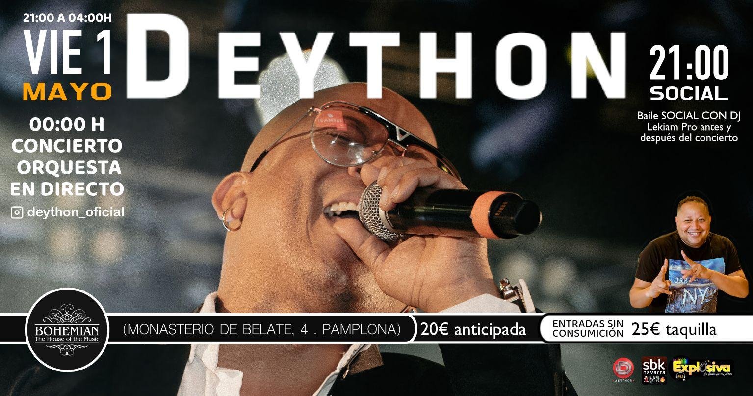 Este viernes 1 de mayo a las 21:00, Deython llega a Bohemian (Pamplona) con un espectacular concierto junto a su orquesta en vivo. Una noche llena de salsa, sabor y energía que te hará bailar sin parar.