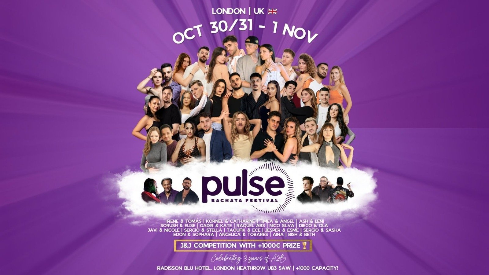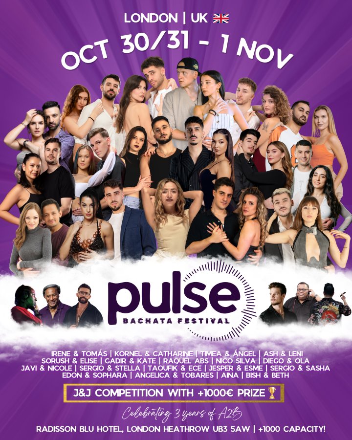 ¡Acompáñanos en la primera edición del Pulse Bachata Festival 2026! #PBF26 Se celebrará en el Radisson Blu Hotel & Conference Centre de Londres Heathrow, un recinto espacioso, con mucho ambiente y de lujo, con capacidad para más de 1000 personas, junto con uno de los carteles de artistas más increíbles que puedas encontrar en toda la UE. Y, por supuesto, no te olvides de nuestra emocionante competición Jack & Jill, ¡con un premio en metálico de 1.000 €! 🏆